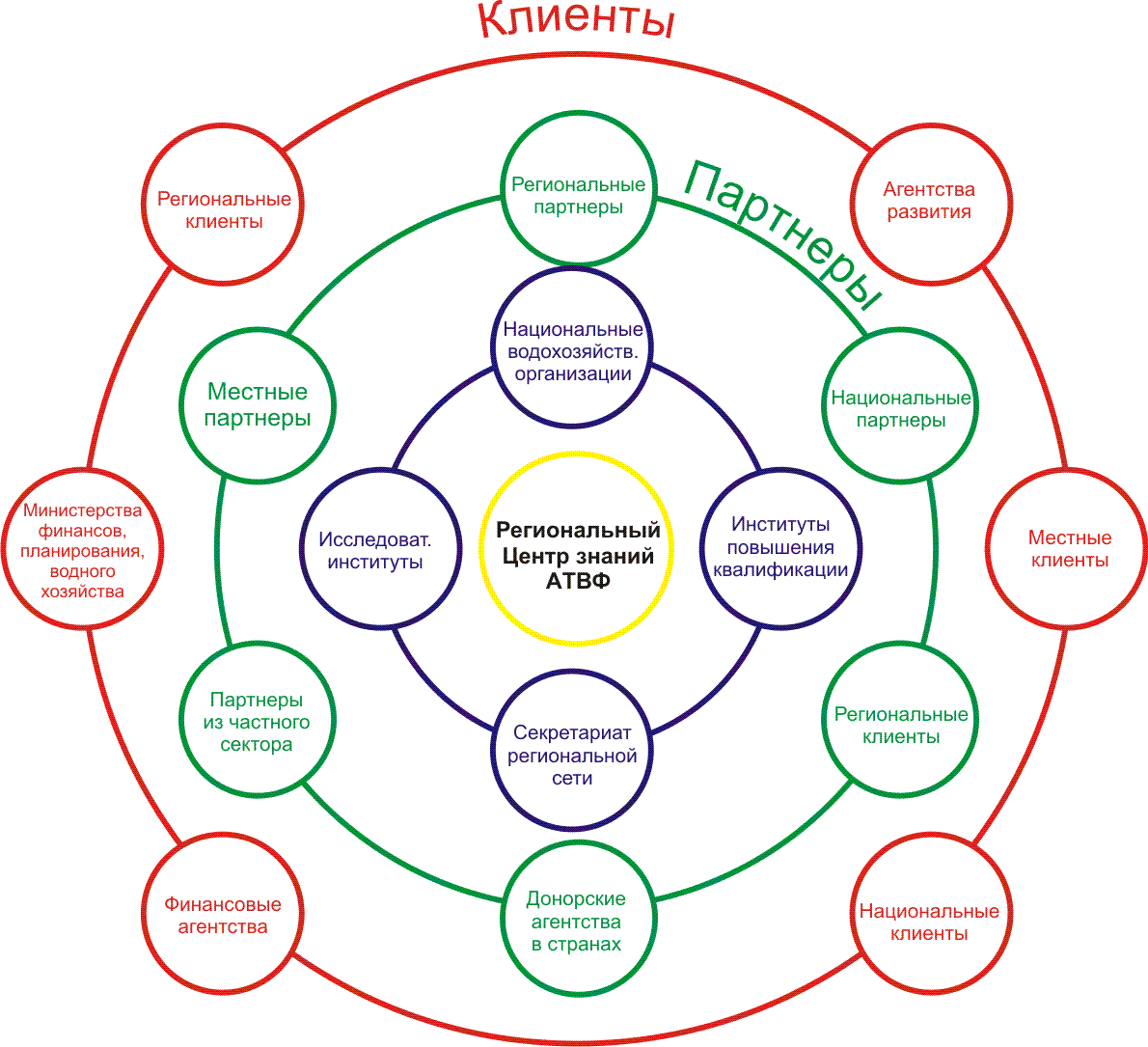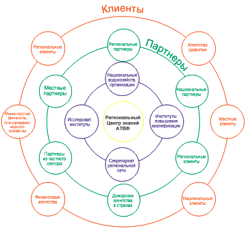 Одним из принципов работы центров является отношение к взаимодействию и сотрудничеству. Персонал центров регулярно встречается с сетью клиентов и партнеров для обсуждения и обмена опытом, генерируя идеи и решения. Таким образом, клиентам региональных центров знаний по воде передаются знания и решения, выработанные мировым сообществом, из которых они могут выбрать наиболее подходящее.