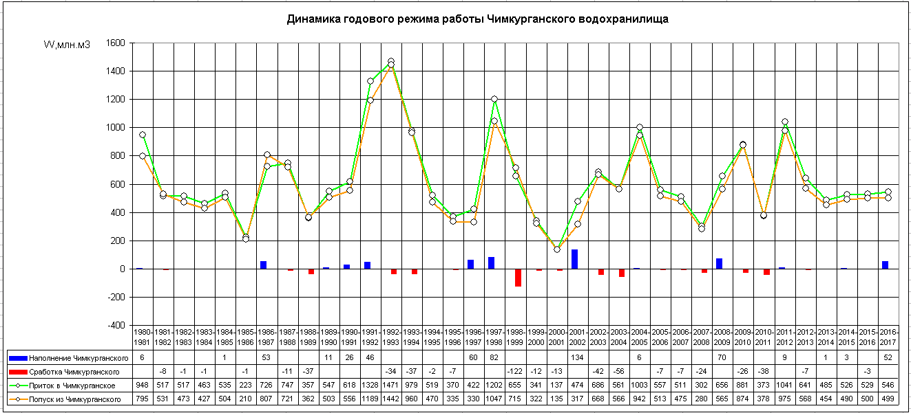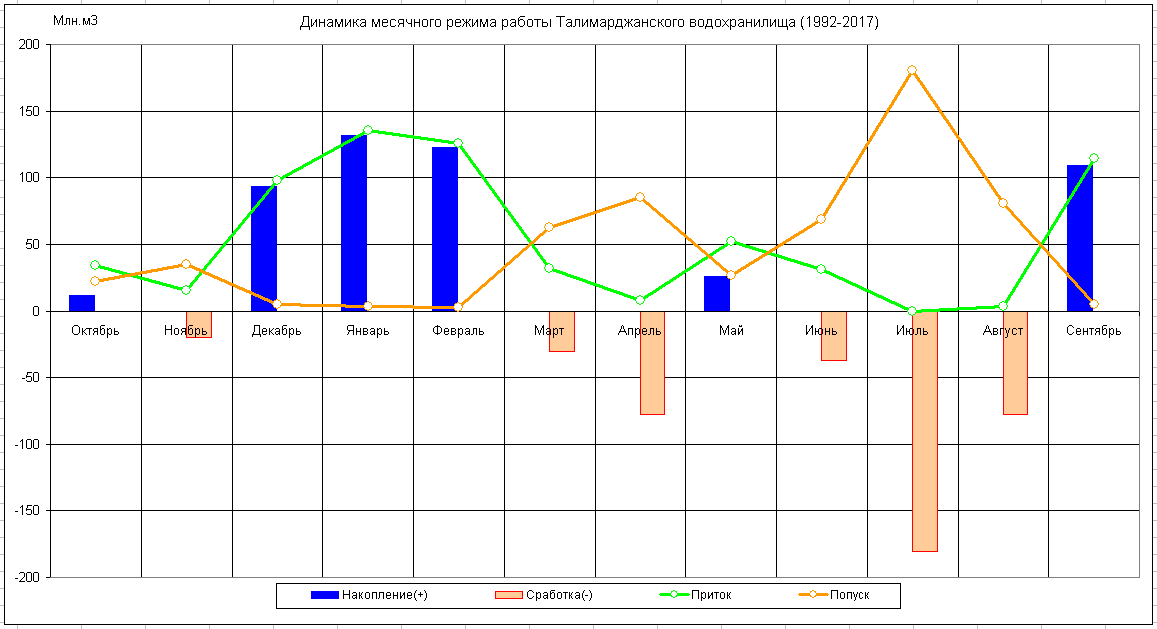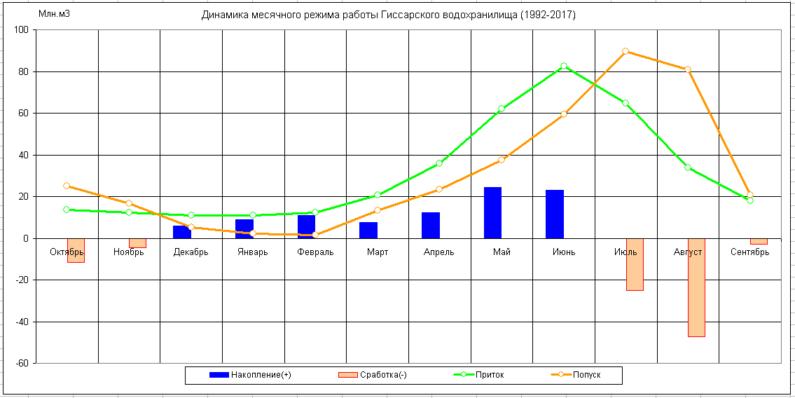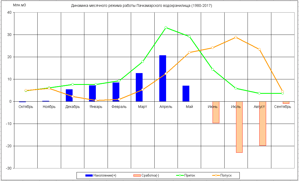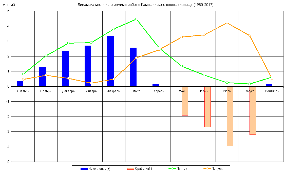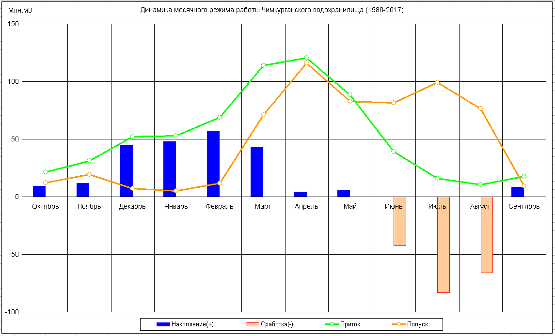 Динамика месячного режима работы водохранилища (1980-2017)