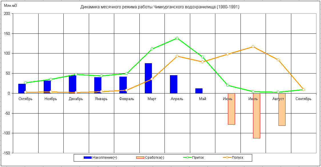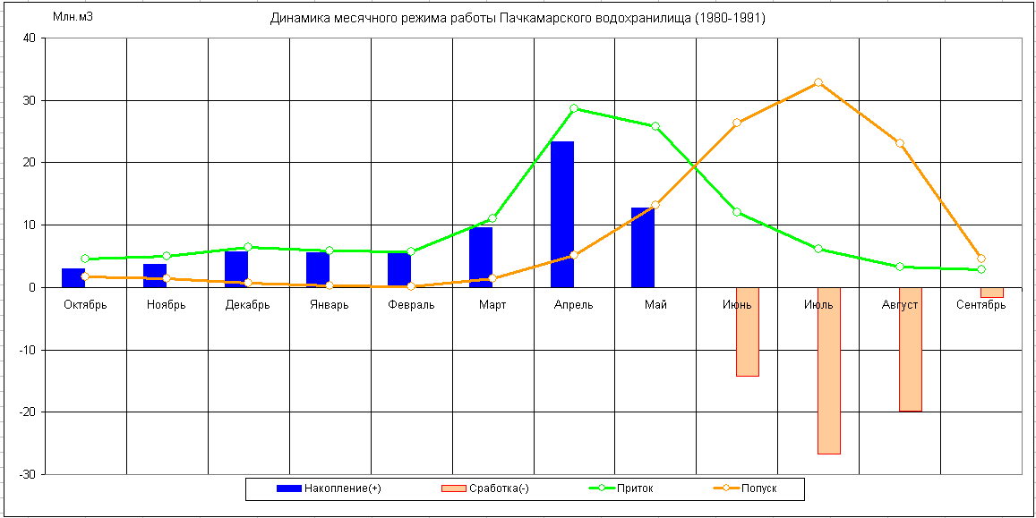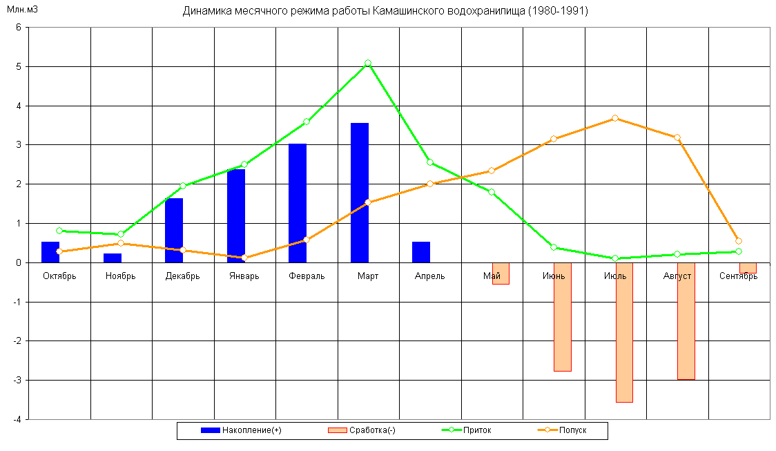 Динамика месячного режима работы водохранилища (1980-1991)