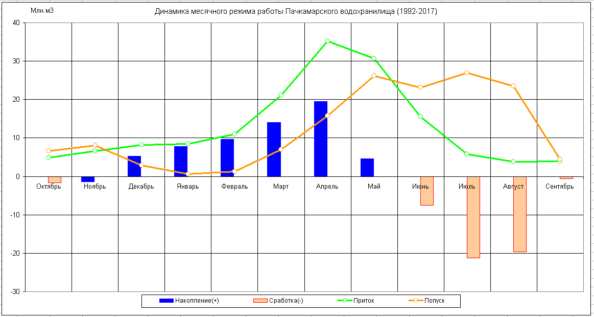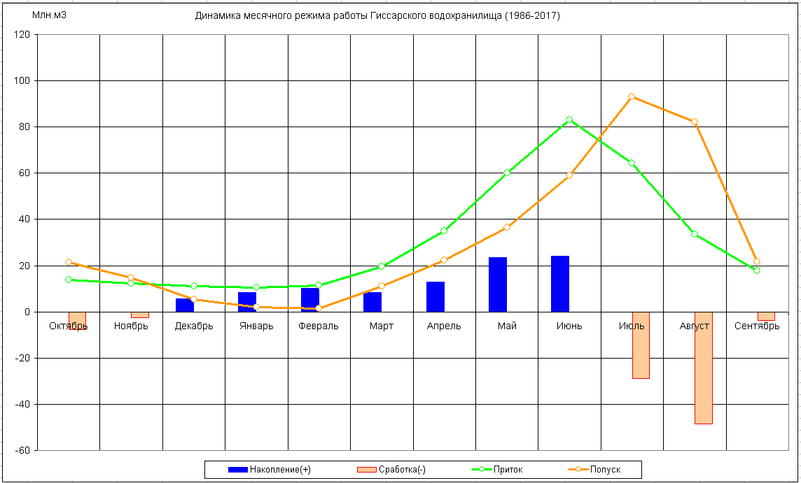 Динамика месячного режима работы водохранилища (1986-2017)