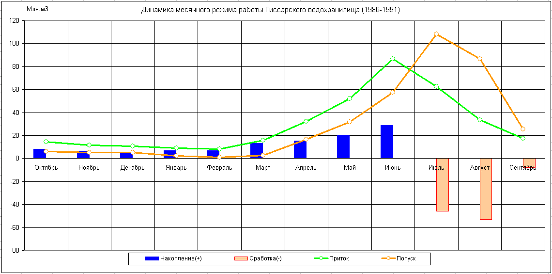 Динамика месячного режима работы водохранилища (1986-1991)