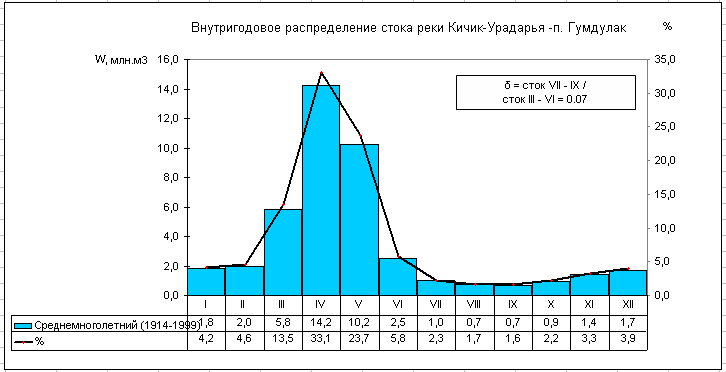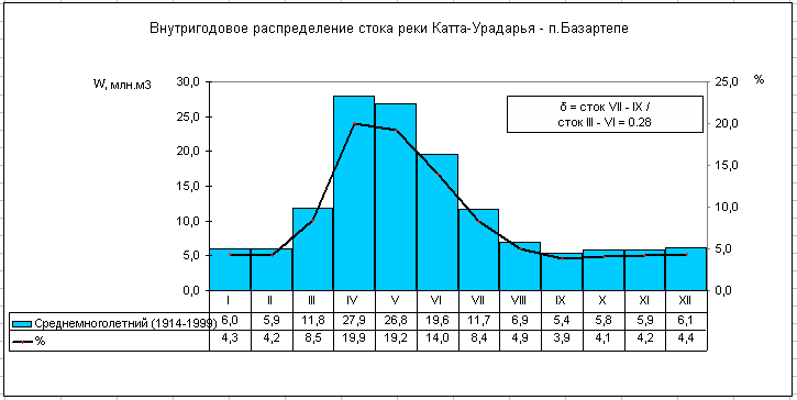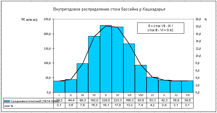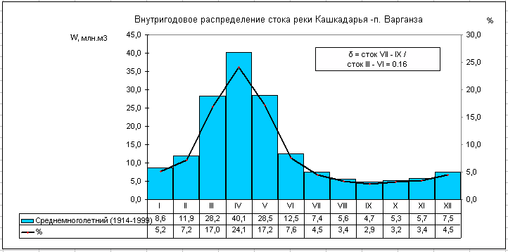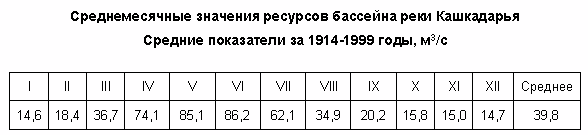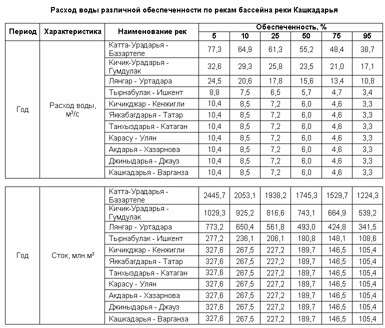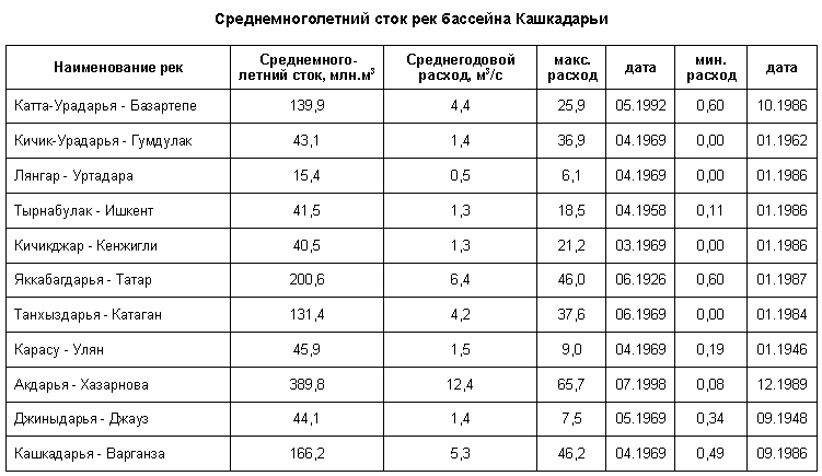 Речной сток бассейна р. Кашкадарьи формируется на западных оконечностях Зарафшанского и Гиссарского хребтов. При выходе из гор в долину, р. Кашкадарья принимает слева ряд притоков, большинство из которых по водности превышают Кашкадарью. Первым ее притоком является маловодная речка Джиныдарья. Ниже по течению также слева впадает самая водоносная река бассейна – Аксу, а еще ниже – Танхаз. Вторая по водоносности река – Яккабаг до Кашкадарьи не доходит; выйдя из гор, она разделяется на два почти равноценных рукава: Карабаг и Кызылсу. Последняя впадает в р. Танхаз и уже по ее руслу воды реки Яккабаг доходят до Кашкадарьи. Последним левым притоком Кашкадарьи, доносящим до нее воду, является р. Гузардарья, образующаяся слиянием рек Каттауру и Кичикуру. Нижнее течение Гузардарьи носит название Карасу.