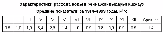 Длина Джиндыдарьи составляет 57 км, площадь водосбора — 367 км2. Питание реки смешанное: снеговое, дождевое и родниковое, согласно некоторым источникам также грунтовое. Половодье длится с марта по июнь, на чью долю приходится 56% годового стока, особенно, высокие расходы воды наблюдаются в апреле, в среднем 3,30 м3/с. Минимум стока выпадает на август и сентябрь. Среднемноголетний расход воды, измеренный у кишлака Джавуз — 1,35 м3/с. Во время весенних проливных дождей в русле реки и её притоков также наблюдаются средние и сильные селевые явления, когда фиксировался расход воды до 46,2 м3/с (26 марта 1970 года). Ширина реки перед впадением равна 2,0 м; глубина — 30 см, дно каменистое.