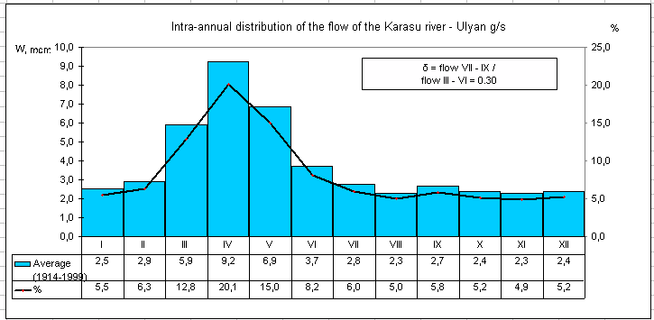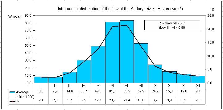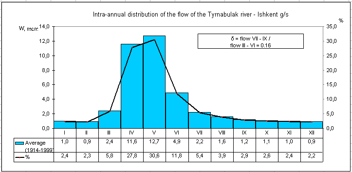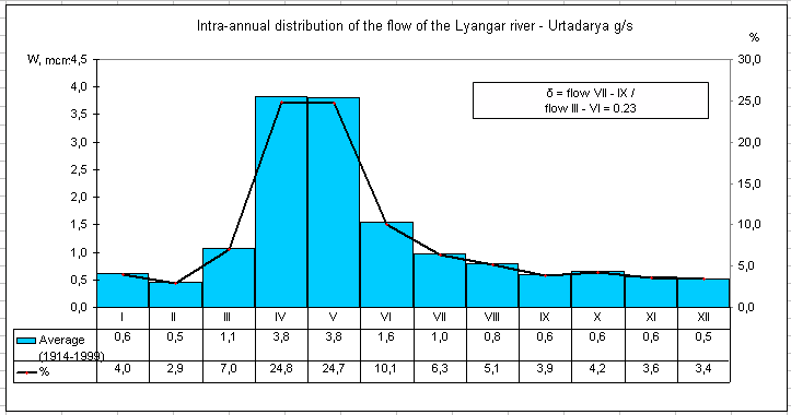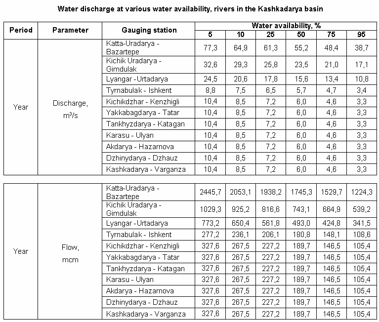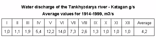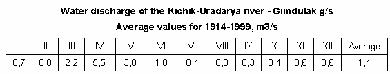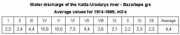 The length of the Katta-Uradarya River is 113 km, and basin area is 1,410 km2. Average multi-year water discharge, as measured in the Bazartepa village, amounted to 4.81 m3/s, with the runoff variability ratio of 0.476 (over the observation period of 1965-2002). The river is fed by snow, rain, and spring waters. High-water period is observed in March-May. In the Bazartepa village, annual water volume is 151.8 mcm; flow average modulus is 3.85 l/s km2; depth of runoff is 121 cm/year.