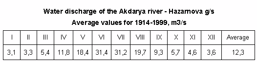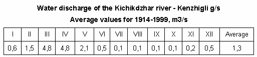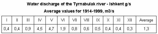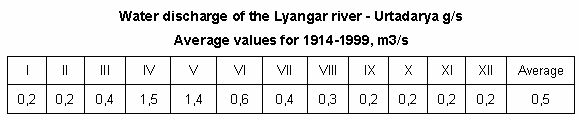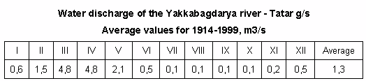 Variations of water discharge by year are typical for the Yakkabagdarya. Average annual indicators vary between 2.15 m3/s (low-water years) and 12.6 m3/s (high-water years). High-water period is from March to August, with the bulk of runoff formed by snow and glaciers in May-July. The highest daily water discharge is in May and June (up to 72.1 m3/s in high-water years and 17 m3/s in low-water years); floods occur at the end of May. In July-August, high water of the Yakkabagdarya decreases to 1-3 m3/s. The lowest water discharge is from December to March.