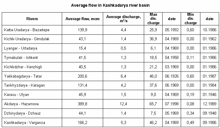 The Kashkadarya River has many tributaries: Djinnidarya, Akdarya (Aksu), Yakkabag, Tankhiz (Tankhizydarya), Guzardarya, Lyangar, and Kyzyldarya. The river is fed by snow and rain; its flow average modulus is 5.7 l/s km2; average multi-year water discharge is 25.3 m3/s (Chirakchi city) and 7.68 m3/s (Kasan city).