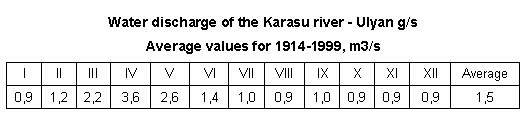 At the Supa village (Igrisu section), the flow velocity amounts to 3 m/s, 1.2 m/s at the Alma village, 2 m/s at the Abad village, and 0.8 m/s at the Ravat settlement, near the mouth. At the Bakyrchi village, the width of the river is 8 m, and the depth is 1 m; at the Kan village, these values amount to 16 m and 50 cm, respectively; at the Nayman settlement — 12 m and 50 cm, respectively; at the Baytkurgan settlement – 20 m and 60 cm, respectively; at the Abad settlement — 10 m and 50 cm, respectively. The nature of bed river is hard.