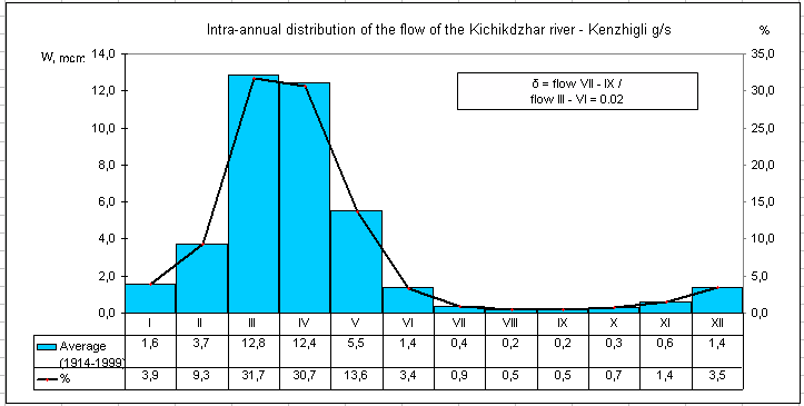 The length of the river is 76 km; basin area is 258 km?. The river is fed by snow and rain. Average multi-year water discharge is 0.9 m3/s. Maximum water discharge is observed in April and May. Intensive mudflows occur in spring.