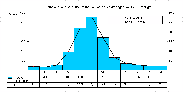 The length of the Yakkabagdarya is 99 km. The basin area is 1,180 km2, of which 755 km? accounts for catchment area. The river is mainly fed by snow and glaciers. In the upper reaches, it is fed by spring waters as well. Average multi-year water discharge, as measured at the Tatar village (50 km away from the head, area of the upper catchment basin is 514 km? at an average altitude of 2,730 m) amounts to 6.11 m3/s. At this point, annual runoff volume is 192.6 mcm; average flow modulus is 12.1 l/s km2; the depth of runoff is 382 cm/year; the runoff variability ratio is 0.444 (over observation period of 1930-2002).