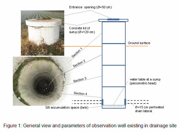 Sump sections are hermitically sealed with cement and further covered by bitumen in order to prevent raised water outflow from the sump. 3rd and 4th sections of inspection sump was marked with the red and blue color with 10 cm scale increments in order to easy eye monitor water level rise between drainage pipe bottom and riser opening (Fig.2A). Water level at the sump was raised freely up to 90 cm from the bottom of drainage pipe (Fig.2B), thereafter flowed through the open riser and drained out into the collector “Sredne-Kyzyl tepa”.