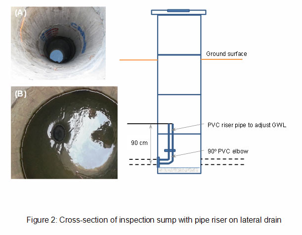 It was reviewed some of groundwater control construction techniques in Technical Report (2014), and among them polyvinyl chloride (PVC) risers on the drainage laterals to control drainage outlet used by Hornbuckle et al. (2005) seemed to be more practical and cost effective. The team of the project developed a similar PVC riser that further was entered into a drainage pipe outlet in the monitoring well (inspection sump) in order to grab free water flow.