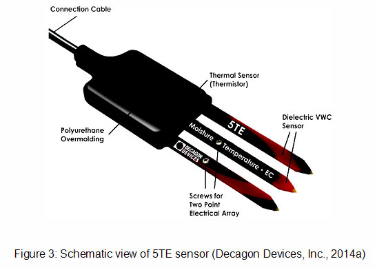 5TE sensor. The 5TE sensor (Decagon devices, Inc.) measures: (1) the apparent dielectric permittivity (ea) of soil to determine the water content (VWC, %) using an oscillator running at 70 MHz; (2) the soil temperature (T, oC) via thermistor in thermal contact with the sensor prongs; and (3) soil electrical conductivity (EC, dS/m) with the screws on the surface of the sensor form a two-sensor electrical array (Fig.3).