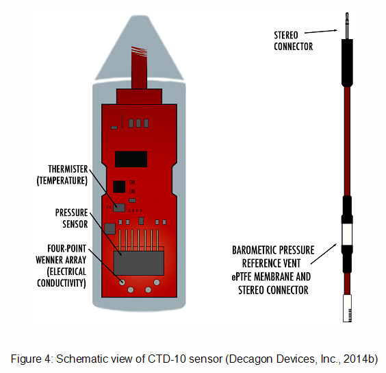 CTD-10 sensor. The CTD sensor (Decagon devices, Inc.) measures: (1) groundwater depth (GWT, m) using a vented differential pressure transducer to determine the pressure from the water column; (2) water temperature (T, oC) using a thermistor in thermal contact with the probe; and (3) electrical conductivity (EC) used by the screws on the surface of the sensor from a four electrode array (Fig.4).