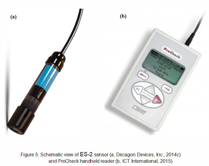 ES-2. The ES-2 sensor (Decagon devices, Inc.) measures: (1) water temperature using an onboard thermistor, and (2) water electrical conductivity using a stainless steel electrode array (Fig.5a). The Decagon ES-2 sensor (with 3.5 mm stereo connector) was designed to work most efficiently with ProCheck handheld reader (Fig.5b). The ES-2 sensor water EC reading is calibrated with laboratory chemical analysis for total dissolved salts (TDS) for the conversion purposes (e.g., dS m-1 into g l-1).