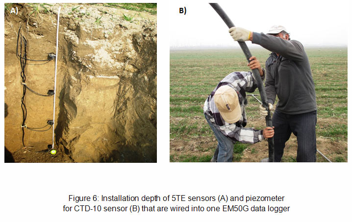 Phenological plots #1, 2, 3 and 6: four 5TE sensors with increments of depth 0-30, 30-60, 60-90 and 90-120 cm (Fig.6A) and one CTD-10 sensor into nearby installed piezometer (Fig.6B).