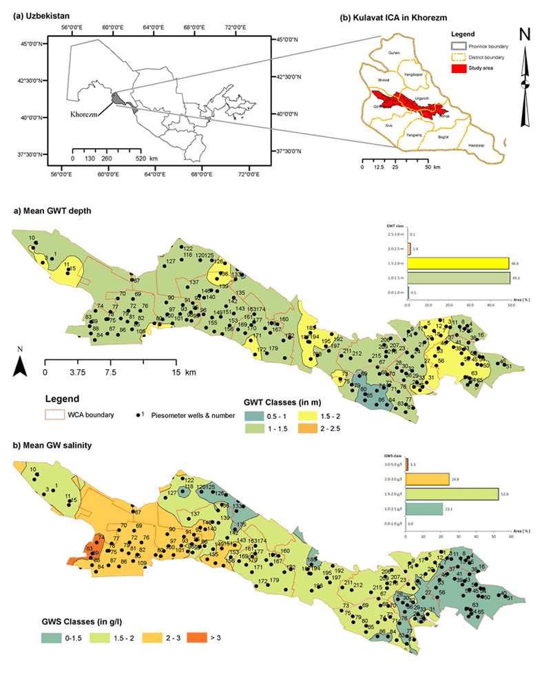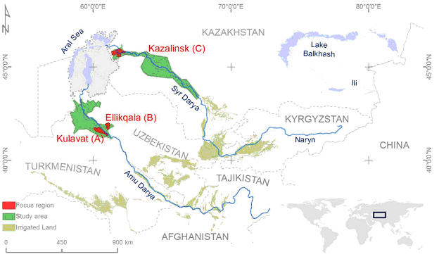 Study area is located in the irrigated lowlands of the Amu Darya (Khorezm and Karakalpakstan in Uzbekistan) and Syr Darya (Kyzylorda in Kazakhstan) River Basins. Three focus regions within the study area, namely “Kulavat” irrigation command area in Khorezm and Ellikkala district in Karakalpakstan, and Kazalisk district in Kyzylorda have been selected.