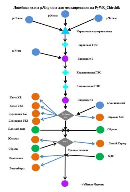 Структура бассейна реки Чирчик, выбранная нами для моделирования «PyWR_Chirchik», где показаны те объекты (г/п на реке Чирчик, гидроузлы, водохранилища, ГЭС, водозаборы, сбросы), которые размещены на участках реки Чирчик.