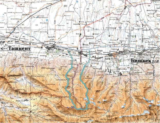 The Isfara river basin is located in northern Tajikistan and south-western Kyrgyzstan. The river originates on the northern slopes of the Turkestan Range at an altitude of 4,500-5,000 m and flows northwards through the Ferghana valley towards the Syrdarya river. The total length amounts to about 120 km. Due to complete use of its flow for irrigation purposes the Isfara river does not reach the Syrdarya.