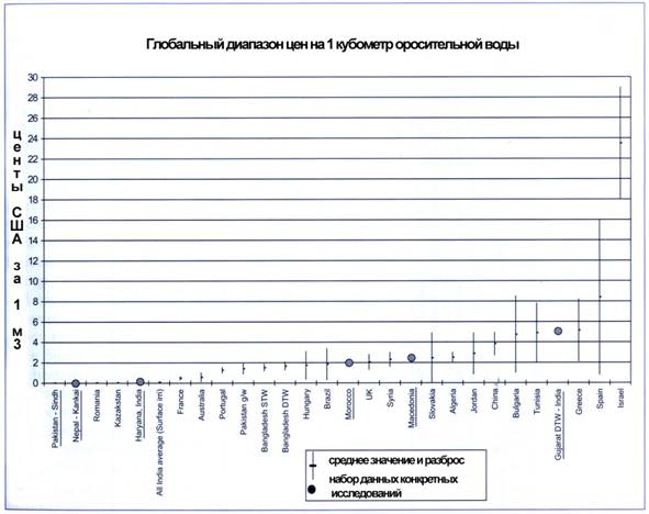 Цена на один кубометр: существует широкий размах варьирования цен на оросительную воду, определенных объемным методом. В Израиле цены варьируют от 18 до 29 центов США за 1 кубометр и растут по ступенчато-пропорциональному тарифу. В Испании цена установлена в размере 16 центов за кубометр воды, отбираемой из глубоких водоносных горизонтов. В Голландии в секторе коммерческого овощеводства и садоводства, где производители орошают тепличные культуры водой из городского водоснабжения, цена за каждый кубометр воды может быть выше 1,30 доллара США, но это в предельный случай. Самая низкая цена была отмечена в Канаде и Румынии, где она составляет не более 0,1 цента за кубометр. Цена в размере около 2 центов за кубометр (20 долл. за 1000 м3) является общей «средней» ценой оросительной воды, но эти остальные цены показывают пределы колебаний.