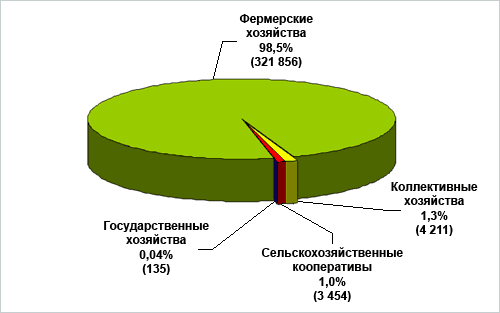 Реформы по демонтажу плановой экономики и переходу на рыночные отношения в Кыргызстане были начаты, в многострадальном сельском хозяйстве, в начале 1990-х годов. Тогда были упразднены 576 колхозов и совхозов и вместо них создавались фермерские хозяйства – как основа Института частной собственности в сельском хозяйстве. Несмотря на преобладающую численность фермерских хозяйств, в сельском хозяйстве Кыргызстана на сегодня функционируют в достаточной степени большое разнообразие (форм) хозяйствующих субъектов (диаграмма 2), некоторые из них являясь рудиментами прежней плановой экономической системы (государственные и коллективные хозяйства), функционируют по стереотипу и по сей день. В 2008 году в сельском хозяйстве Кыргызстана было 326,7 тыс. хозяйствующих субъектов, в том числе 135 государственных хозяйств (это семеноводческие, племенные хозяйства, опытные станции и другие), 4211 коллективных хозяйств, 3454 сельскохозяйственных кооперативов и 321,8 тыс. фермерских хозяйств. Кроме того, имеется 726,6 тыс. личных подсобных хозяйств граждан.