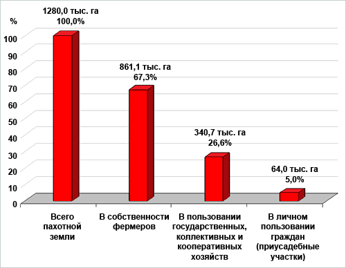Стержневой частью проводимой реформы стала передача земли в частную собственность фермерам и ее Конституционное закрепление (1998г.). Из всей пахотной земли (1280,0 тыс. га) 861,1 тыс. га (67,3%) находится в собственности фермерских хозяйств, 340,7 тыс. га (26,6%) земли в пользовании коллективных, государственных хозяйств и кооперативов и 64,0 тыс. га (5,0%) в личном пользовании граждан, как приусадебные участки (диаграмма 3).