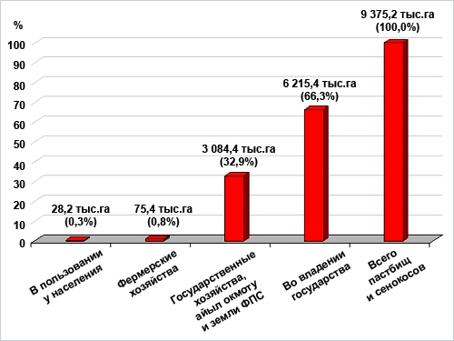 Основная часть (более 66%) пастбищ и сенокосов находится в собственности государства, одна треть (33%) в пользовании государственных хозяйств, айыл окмоту и всего лишь около 1% во владении фермерских хозяйств (на одно фермерское хозяйство приходится 0,23 га пастбищ, просто парадоксально, по логике вещей они должны были находиться в пользовании у фермеров), что не позволяет развиваться фермерам, занимающимся животноводством и показывает о серьезных перекосах, существующих в сфере использования пастбищных ресурсов. Пастбищные ресурсы в течение длительного времени эксплуатировались в погоне за дешевой продукцией очень интенсивно (можно сказать варварски) без элементарных усилий по их улучшению и рациональному использованию, в результате они сегодня в сильной степени деградированы и требуют серьезных капиталовложений.