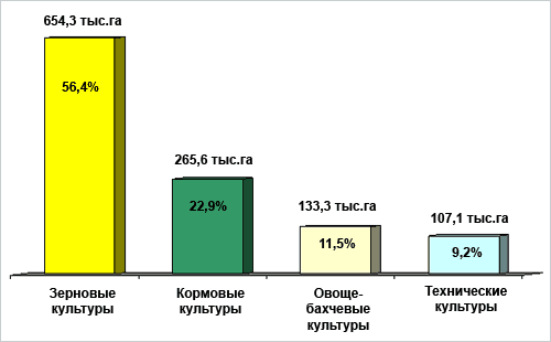 Диаграмма 5. Структура посевных площадей сельскохозяйственных культур в Кыргызстане за 2008 год (в тыс. га и %, общая площадь - 1160,3 тыс. га)