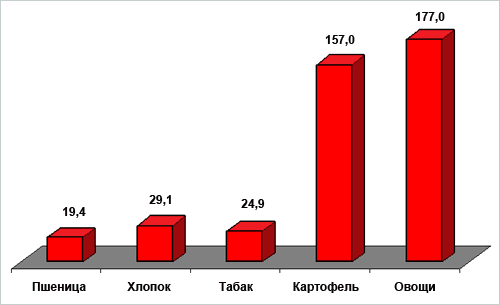 Урожайность с/х культур в центнерах с 1 га в 2008 году было: пшеницы – 19,4, хлопок – 29,1, табак – 24,9, картофель – 157, овощи – 177.