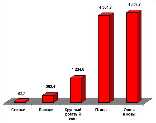 Динамика поголовья сельскохозяйственных животных в последние годы имеет тенденцию к системному увеличению, если даже на небольшую величину, ежегодно. Если провести сравнительный анализ с прошлой плановой экономикой, то поголовье крупного рогатого скота достигло советского периода, лошадей превысило на 100,0 тыс. голов, птиц составляет одну четверть, свиней одну десятую часть и овцы около 50%. Имеющийся на сегодня спрос на животноводческую продукцию, как в республике, так и в регионе создают предпосылки к дальнейшему увеличению поголовья животных. Однако наращивать производство животноводческой продукции в республике за счет экстенсивного увеличения поголовья, может опять привести к наращиванию хозяйственного давления на природную среду и нарушению экологического равновесия. Поэтому увеличение объема производства продукции животноводства следует осуществлять только за счет интенсификации ведения отрасли – увеличение продуктивности животных и улучшения технологий.