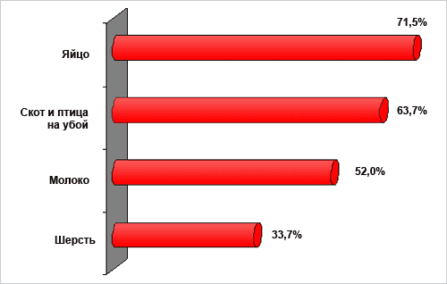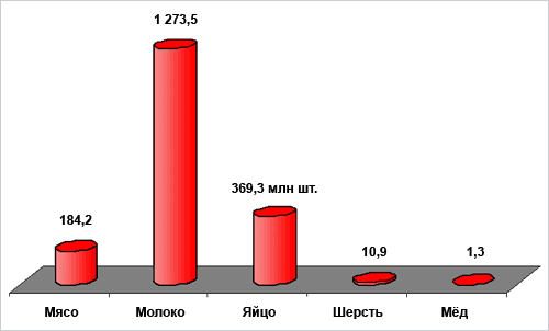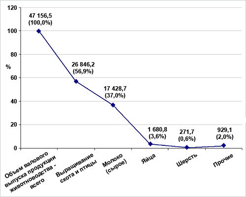 В общем объеме выпуска продукции животноводства в денежном выражении абсолютная часть (94%) приходится на долю молока и мяса, и лишь незначительная часть на яйцо, шерсть и прочие продукции отрасли.