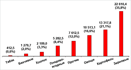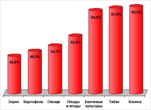 Валовой сбор продукции растениеводства. Валовой сбор продукции растениеводства в 2008 году составлял, в тыс. тонн: зерно – 1510,9, в т.ч. пшеницы - 746,2, хлопка – 95,1, табак – 13,6, картофель – 1334,9, овощи и бахчевые культуры – 822,6. Потребность населения Кыргызстана зерном собственного производства не удовлетворяется, поэтому в 2008 году было импортировано зерно в объеме 557,0 тыс. тонн или более 50% потребности. Произведенная продукция растениеводства в основном остается внутри республики, экспортируется лишь картофель (26,2%) и овоще-бахчевые культуры (18,8%), что является подтверждением неразвитости товарного производства в сельском хозяйстве Кыргызстана.