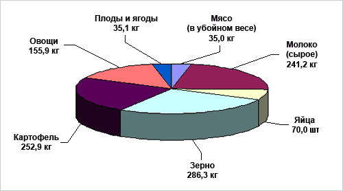 Производство основных видов продукции сельского хозяйства на душу населения (в кг): мяса (в убойном весе) – 35, молока (сырое) – 241,2, яйца – 70 штук, зерна – 286,3, картофеля – 252,9, овощи – 155,9, плоды и ягоды – 35,1.
