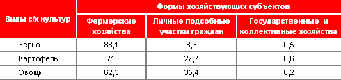 Таблица 1. Структура производства основных продуктов растениеводства по категориям хозяйств в 2008 году (в %):