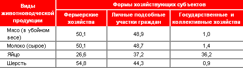 Основные и наиболее потребляемые виды животноводческой продукции (молоко и мясо) и сырья - шерсти в Кыргызстане производятся фермерскими хозяйствами и личными подсобными хозяйствами граждан практически в равной степени по 50%, доля государственных, коллективных хозяйств здесь незначительная (1-1,5%), единственное на долю фермерских хозяйств приходится наименьший объем производства яиц (26,6%) и примерно в одинаковом объеме по 36% государственным и личным подсобным хозяйствам. Эти данные показывают о значительно высоком уровне производительности труда в личных хозяйствах граждан, которые, имея всего лишь 5% земли, производили с фермерами наравне 50% молока и мяса, которые, имея в 13 раз больше земли (67%), производили такое же количество продукции. Если сравнивать данные двух таблиц, то в отличие от продукции животноводства, подавляющее часть растениеводческой продукции производятся фермерскими хозяйствами, то есть для которых еще имеются огромные резервы по увеличению производства продукции животноводства, которая имеет значительно большую прибыльность, чем растениеводческая продукция.