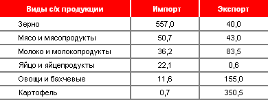 Таблица 3. Экспорт и импорт сельскохозяйственной продукции (данные за 2008 год, в тыс. тонн)