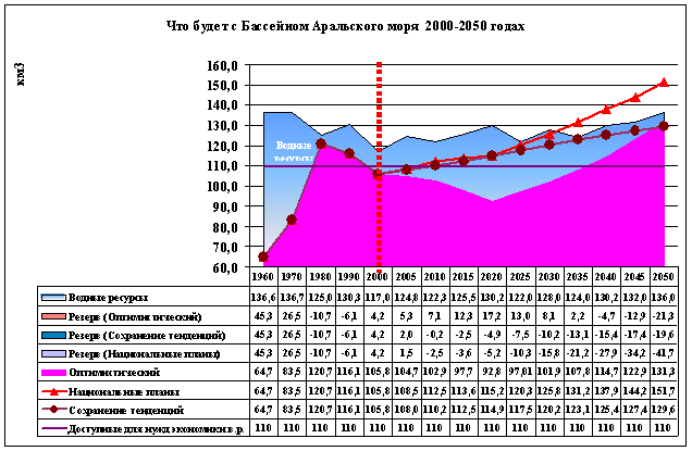 На основании прогнозов, смоделировавших перспективное развитие региона, подготовленных нами совместно с двумя международными институтами, по которым проработаны 4 варианта развития, причем 3 из них в двух подвариантах с учетом и без учета возможного изменения климата, видно, что до 2025 г., даже когда численность населения составит 65-70 млн. чел. (здесь и далее в сценариях развития рассматривается только часть Центральной Азии входящей в бассейн Аральского моря), регион сможет обеспечить себя собственными продуктами питания и будет обладать определенным потенциалом экспорта сельскохозяйственной продукции и в некоторых вариантах развития образуется определенный резерв водных ресурсов.