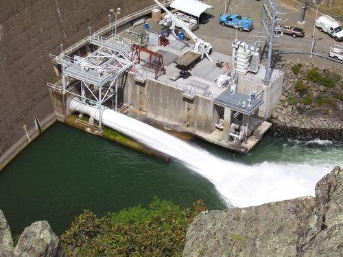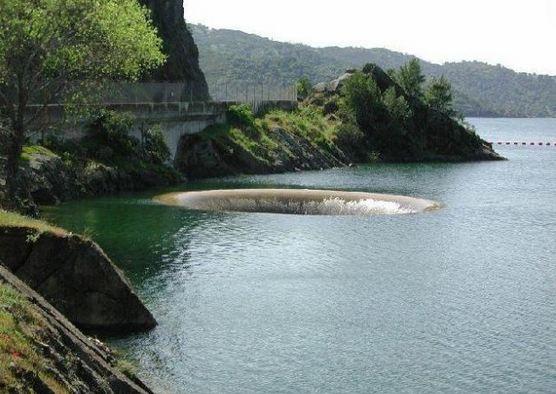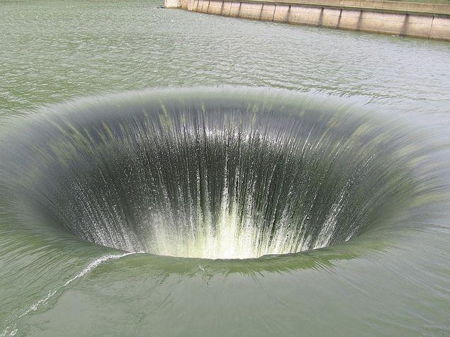 Отверстие этой гигантской дыры от самой плотины расположено примерно в 60 м. Потоки воды начинают перетекать в эту трубу, если объём воды в озере становится больше 2 млн. куб. м. Труба, глубиной 21 м, сделана в форме конуса. За одну секунду труба может пропустить через своё отверстие более 1370 куб. м. воды. Диаметр входного отверстия составляет почти 22 м, затем он постепенно сужается до 8,4 метров. По понятным причинам плавание около этой дыры запрещено. Недалеко от гидрослива по всему его периметру установлены специальные ограждения, которые не дадут лодочникам и смельчакам приблизиться к опасной зоне.
