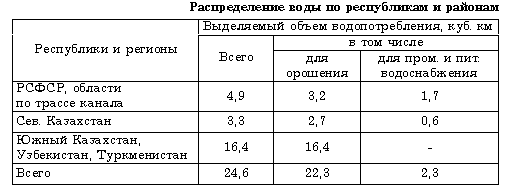 "Основные показатели проекта: объем отбираемого стока брутто - 27,2 км3/год (около 8%) с водозабором из р. Оби ниже впадения в неё р. Иртыша в районе п. Белогорье; распределение перебрасываемого стока в объеме 24,6 км3/год (с учетом потерь на фильтрацию и испарение): Россия - 4,9; Северный Казахстан - 3,3; Южный Казахстан, Узбекистан, Туркменистан - 16,4; расход воды в Главном канале от 1 160 м3/с (летом) до 650 м3/с (зимой); направление трассы канала - Тургайское; длина канала - 2 550 км; прирост орошаемых земель - 4,5 млн.га; в т.ч. в РФ - 1,5 млн.га; стоимость строительства - 18,4 млрд.руб., в т.ч. главного канала с сооружениями - 13,6 млрд.руб.; объем земляных работ - 6,4 млрд.м3; объем бетонных работ - 15 млн. м3; металлоконструкции - 902 тыс.т; высота подъема воды - 110 м; установленная мощность насосных станций - 2,9 млн кВт; годовая потребность электроэнергии - 11,2 млрд.кВт.ч.