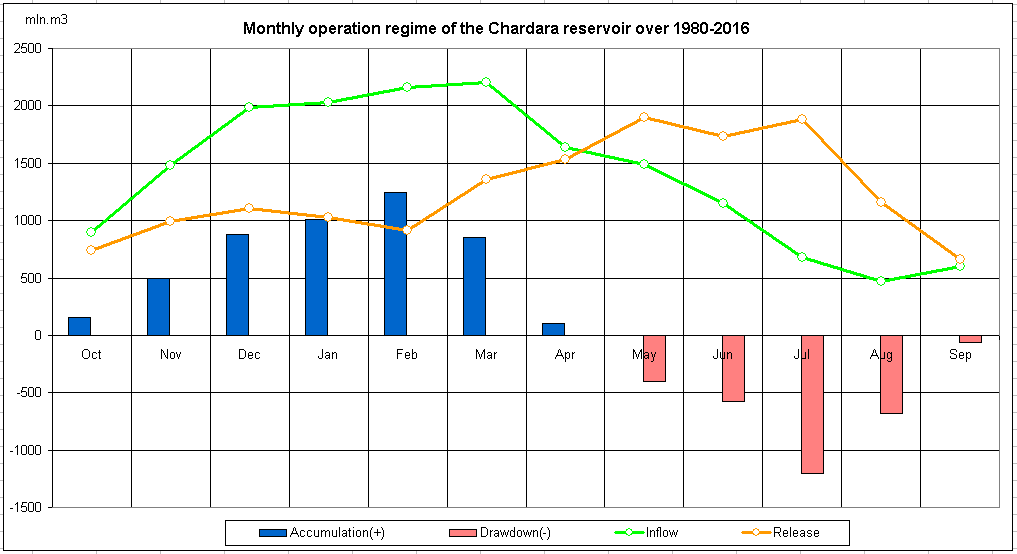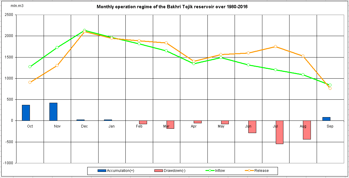 Monthly operation regime of the reservoir over 1980-2016