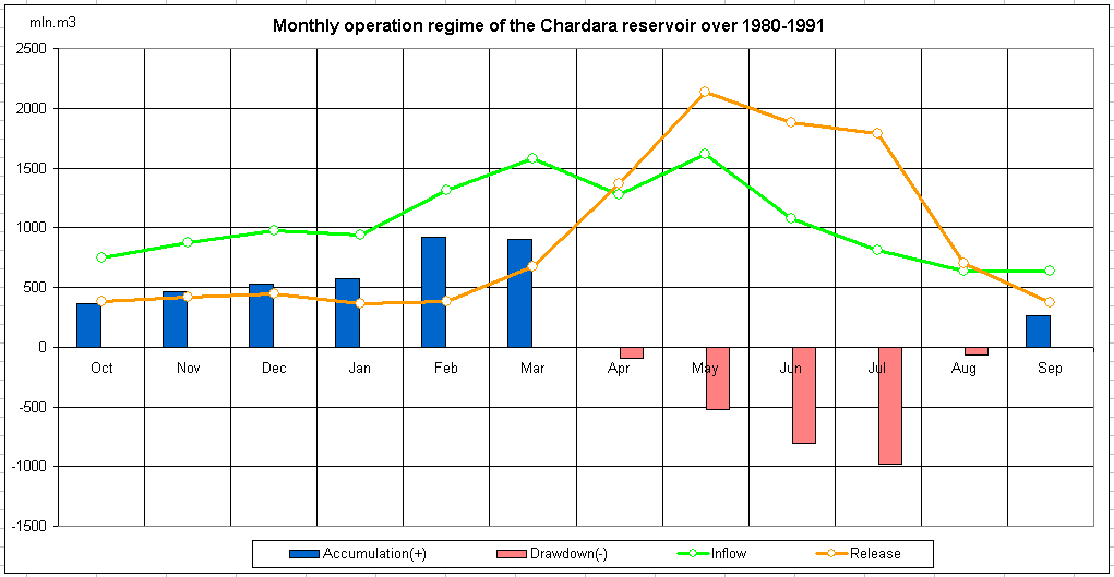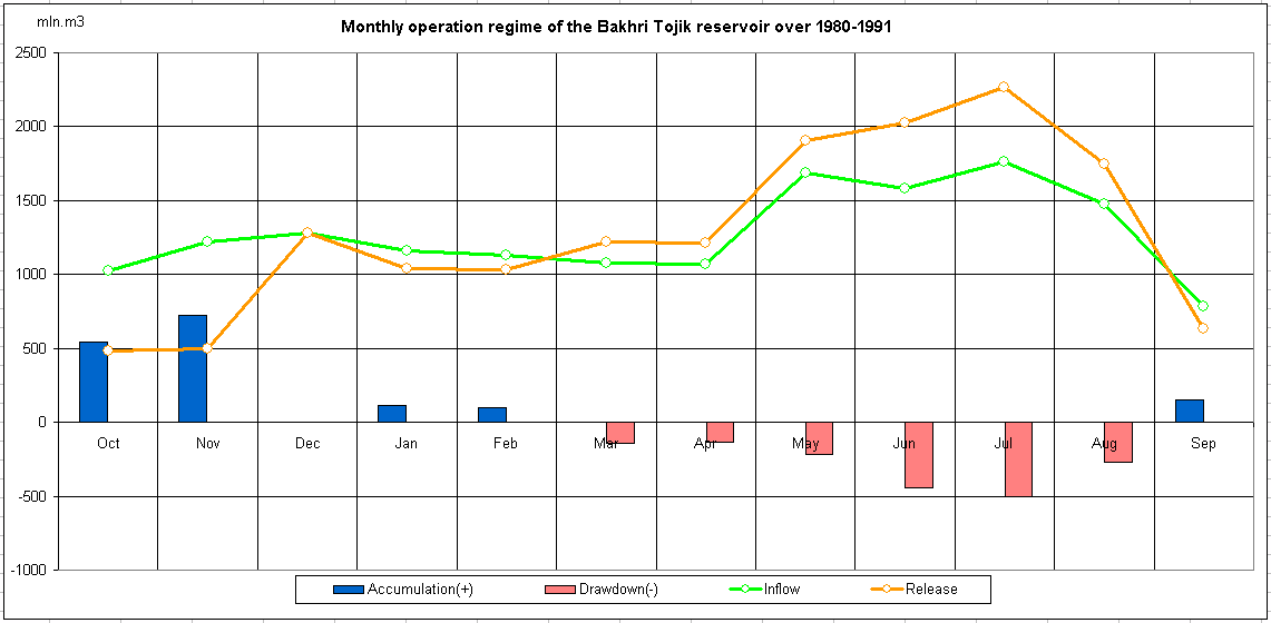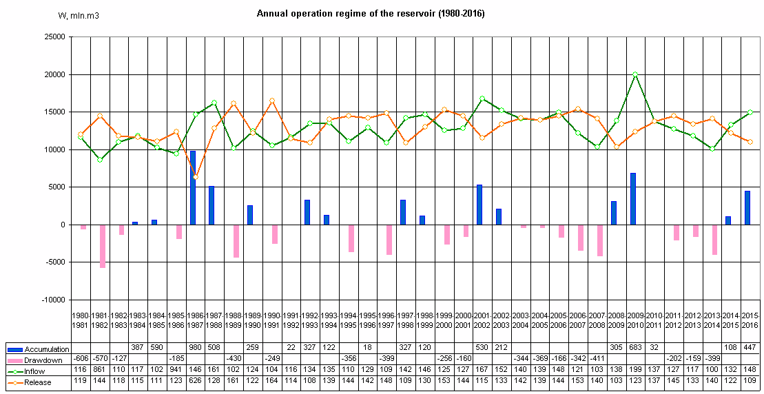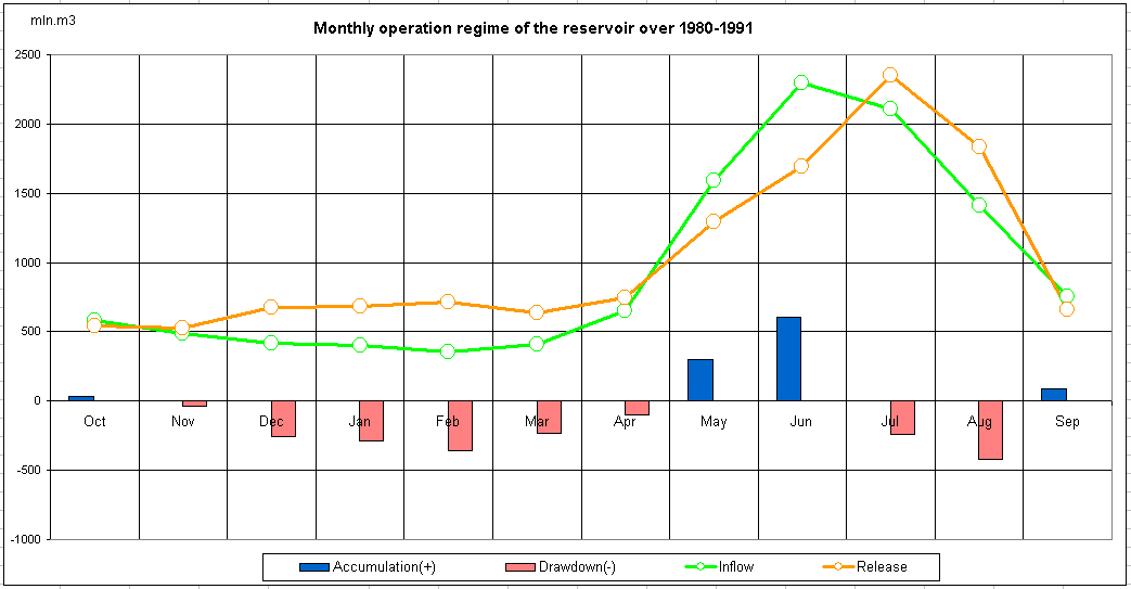 Monthly operation regime of the reservoir over 1980-1991