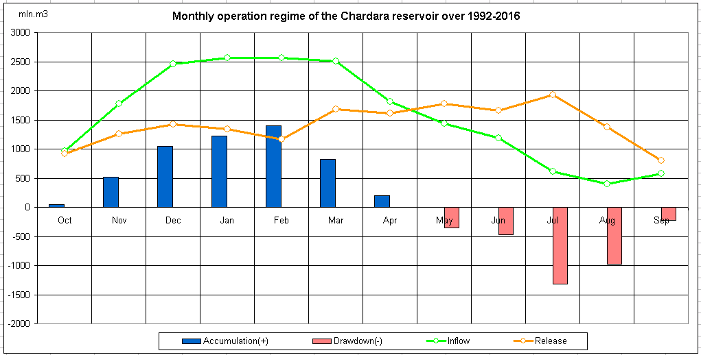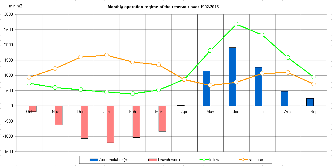 Monthly operation regime of the reservoir over 1992-2016