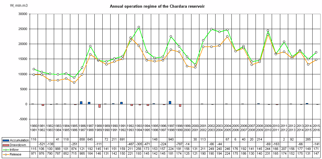 • Chardara reservoir: total capacity 5.4 km3, including effective capacity of 4.4 km3.