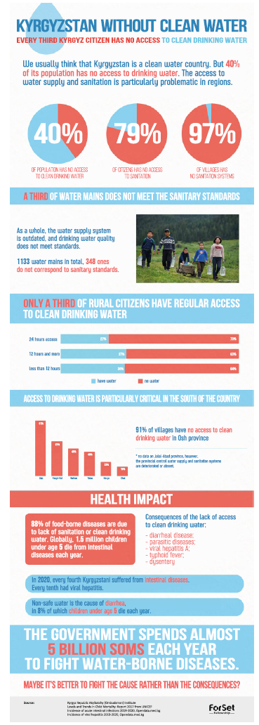 Clean water projects were implemented in Issyk-Kul, Chui, Osh and Batken provinces. Besides, projects were undertaken for the construction and rehabilitation of irrigation systems and the improvement of water accounting.