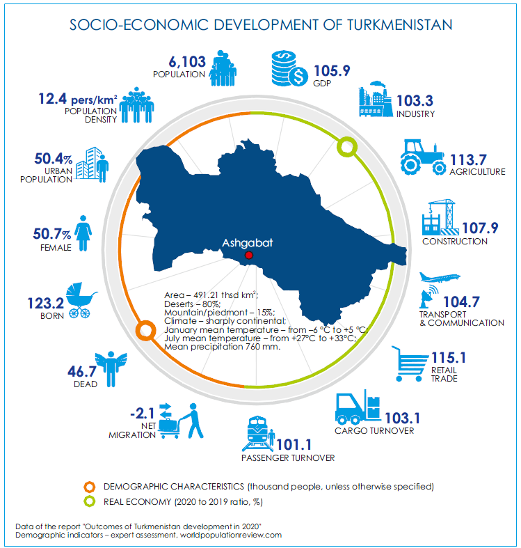 In 2020, the President of Turkmenistan visited Azerbaijan (11 March), held 20 meetings with official representatives of other countries, heads of foreign corporations and companies, and had 40 telephone calls. Ashkhabad was visited by the Prime-Minister of Kazakhstan, who paid a working meeting on 17 September.