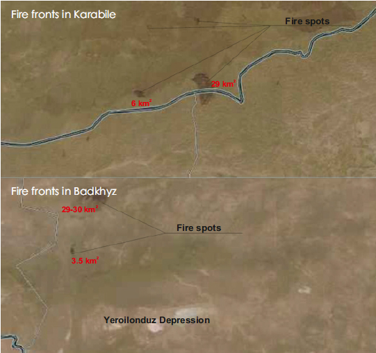 Fires. Every year, steppe fires occur in Badkhyz and Karabil in the south of Turkmenistan. In 2020, fires were recorded from May till August.