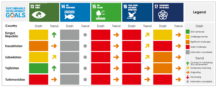 In this section we present an overview of progress towards the SDGы in Central Asian countries. Information is drawn from The Sustainable Development Goals Report 2020 - a global assessment of countries' progress towards achieving the SDGs. It is a complement to the official SDG indicators and the voluntary national reviews. The report presents a global overview of progress towards the SDGs before the pandemic started, but it also looks at some of the devastating initial impacts of COVID-19 on specific Goals and targets. The report was prepared by the United Nations Department of Economic and Social Affairs in collaboration with over 200 experts from more than 40 international agencies, using the latest available data and estimates.