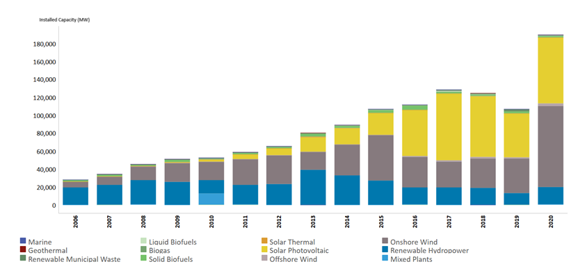 Figure 1: 2006-2020 Global annual additions of RE capacity (IRENA)