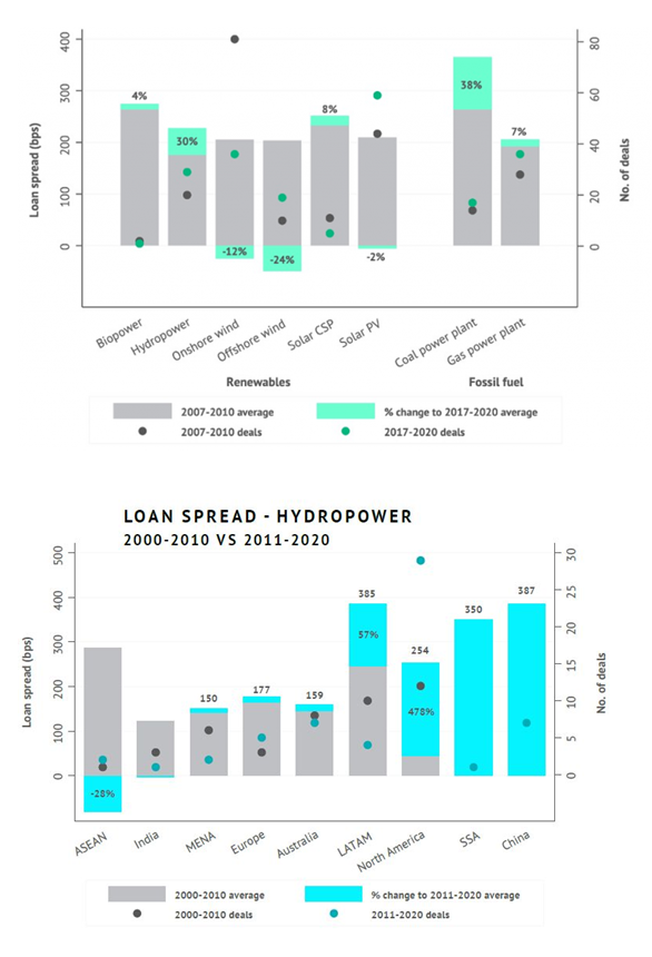 A study published in April 2021 by Oxford Sustainable Finance Programme showed that over decade the financing costs for coal-fired power plants have increased on average by 38% and for hydropower by 30%, while for wind power and solar PV it was falling. The study also attempts comparison across regions, indicating dramatic rise in costs of hydropower loan servicing in Latin America and relative decrease in ASEAN countries.