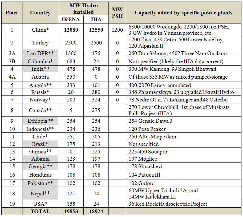 Notes: “A” marks difference between IRENA and IHA data. X/Y means that X MW was added to a project with Y full planned capacity.