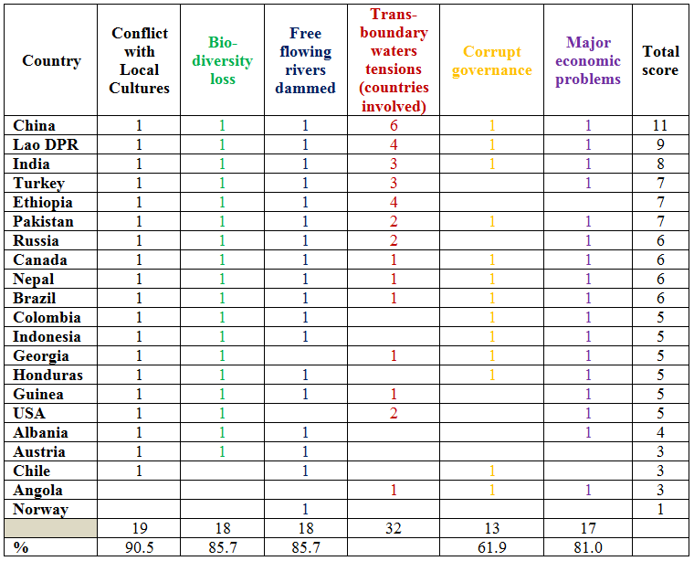 For all generic problems we marked by “1” serious threat\problem\impact inside a given country for which we have sufficient evidence within the last decade. Only in case of “transboundary waters conflict” we counted number of neighbours with which this country has a conflict\serious issue related to hydropower impacts . We have evidence on serious unresolved conflicts with local communities, irreversible impacts on biodiversity, damming free-flowing rivers, economic problems caused by hydropower projects for more than 80% of championing countries. Significant transboundary impacts and conflicts are present in 14 countries out of 21 involved 32 additional countries.